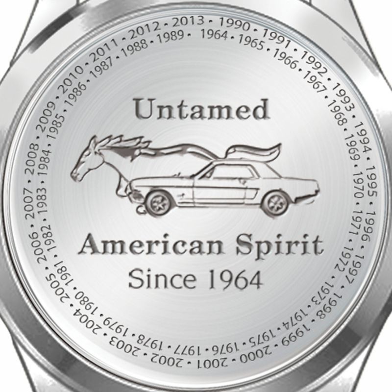 - A commemorative tribute is etched on the back that reads: 'Untamed American Spirit Since 1964', with a Mustang and pony, whilst 'Ford Mustang' is etched on the side