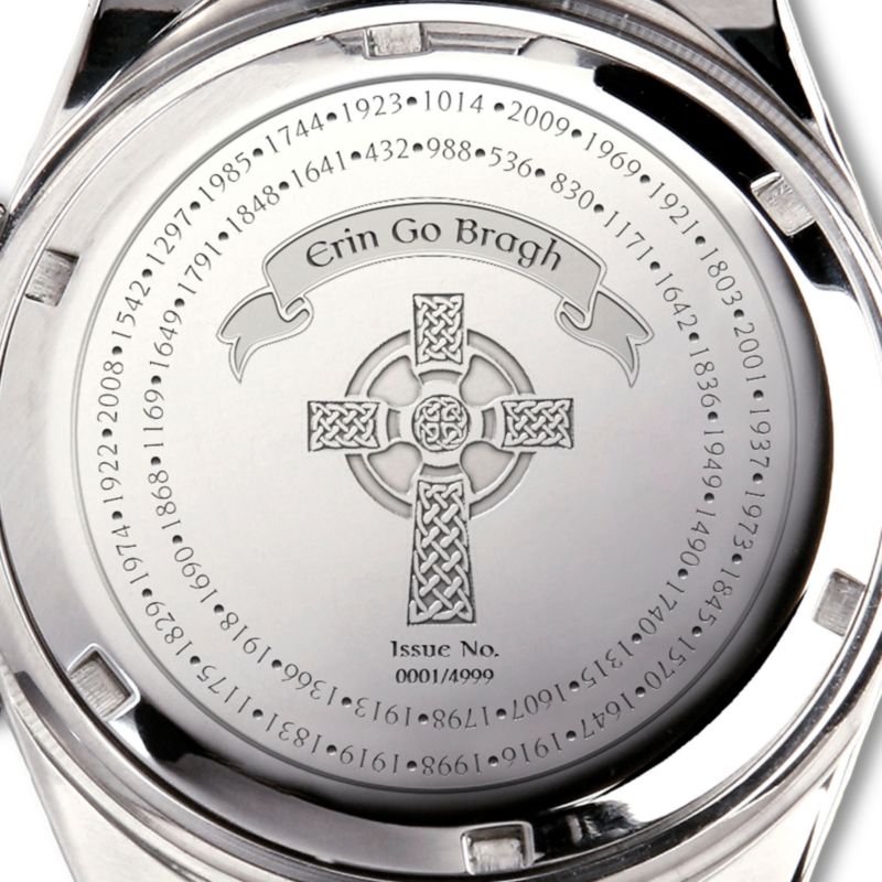Expertly handcrafted from gleaming stainless steel, this exceptional timepiece is a bold salute to our great nation! Embellished with gold-plated accents and intricately engraved on the side with ’Sworn To Be Free’ – an excerpt from the Irish National Anthem! Etched on the reverse is the Irish Cross – which has long been a symbol of our beautiful nation – and pivotal dates within Irish history, including St. Patrick's return to Ireland in 432AD. The dial depicts a gold-plated raised Celtic cross, in addition to the proud sentiment: 'Ireland Forever’ alongside its Irish Gaelic translation ’Erin go Bragh’.