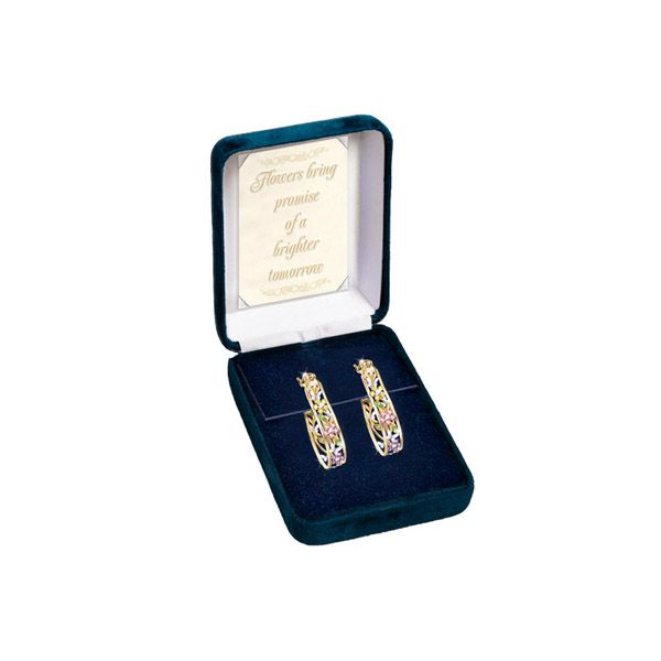Stunning sterling silver cuff-style pierced earrings are richly plated in 24-carat gold, and feature an open-work filigree vine design. The vine is adorned with sparkling cubic zirconia flowers in colours of goldenrod, pink peony and lilac, leaves of peridot-green and sterling silver butterflies. Arrive in a custom-designed presentation case with a touching sentiment card. Strong demand is expected for this meaningful women's jewellery exclusive from The Bradford Exchange. Order now!